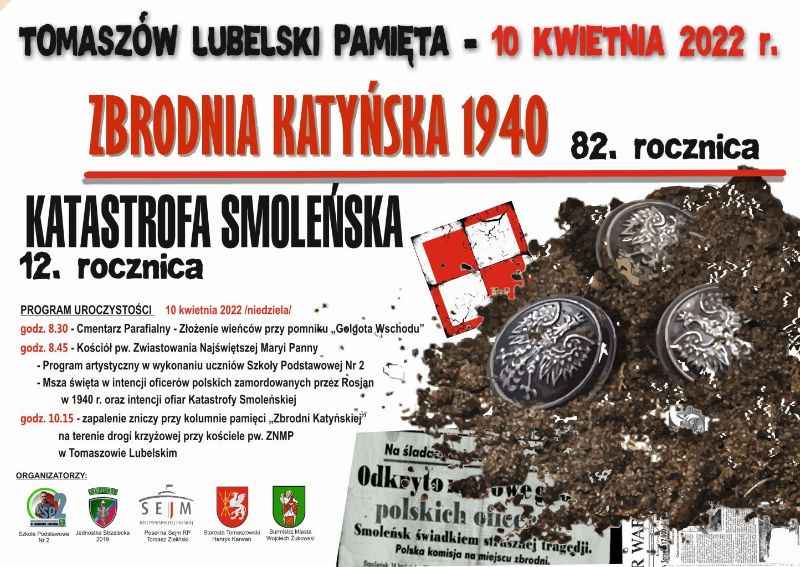Zbliżają się uroczystości upamiętniające zbrodnię katyńską 1940. W tym roku przypada 82 rocznica. W naszym mieście obchodzimy ją pod hasłem "Tomaszów Lubelski pamięta - 10 kwietnia 2022 r.”