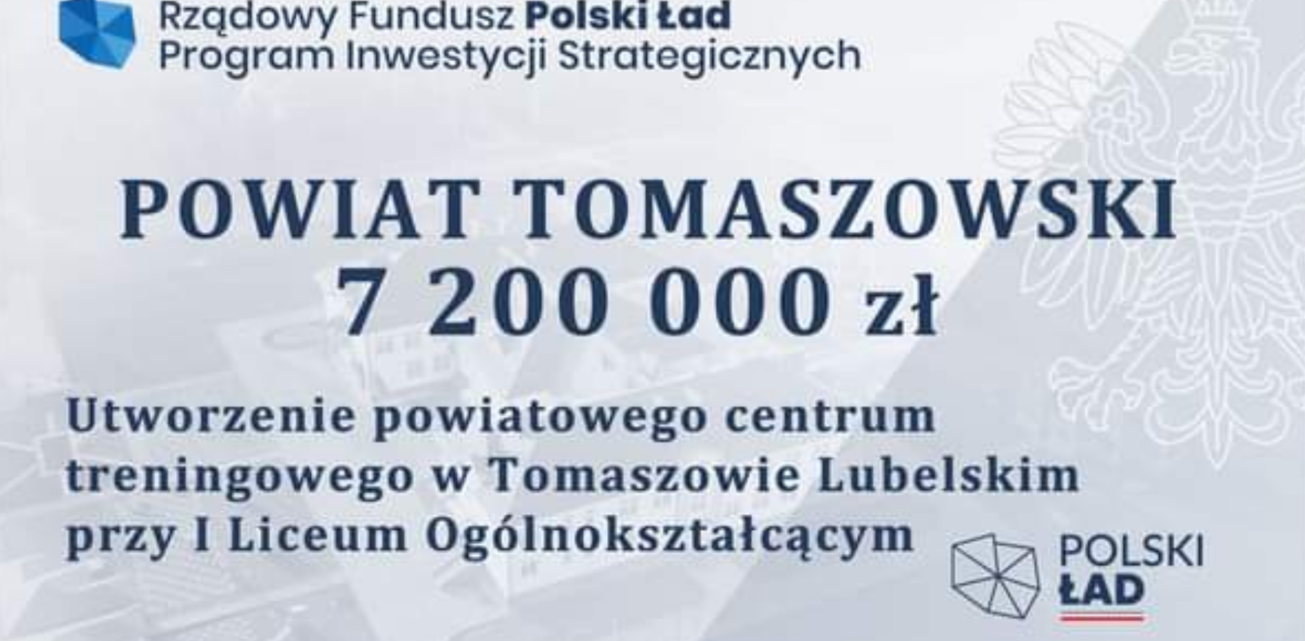 Starostwo Powiatowe w Tomaszowie Lubelskim w ramach programu inwestycji strategicznych #Polski Ład otrzymało 7 200 000 zł z przeznaczeniem na budowę nowoczesnego zestawu obiektów sportowych oraz zagospodarowanie terenu przy I Liceum Ogólnokształcącym im. Bartosza Głowackiego w Tomaszowie Lubelskim. Dodatkowo Powiat Tomaszowski przeznaczy 800 000 zł ze środków własnych i całość inwestycji obejmie kwotę 3 mln zł.