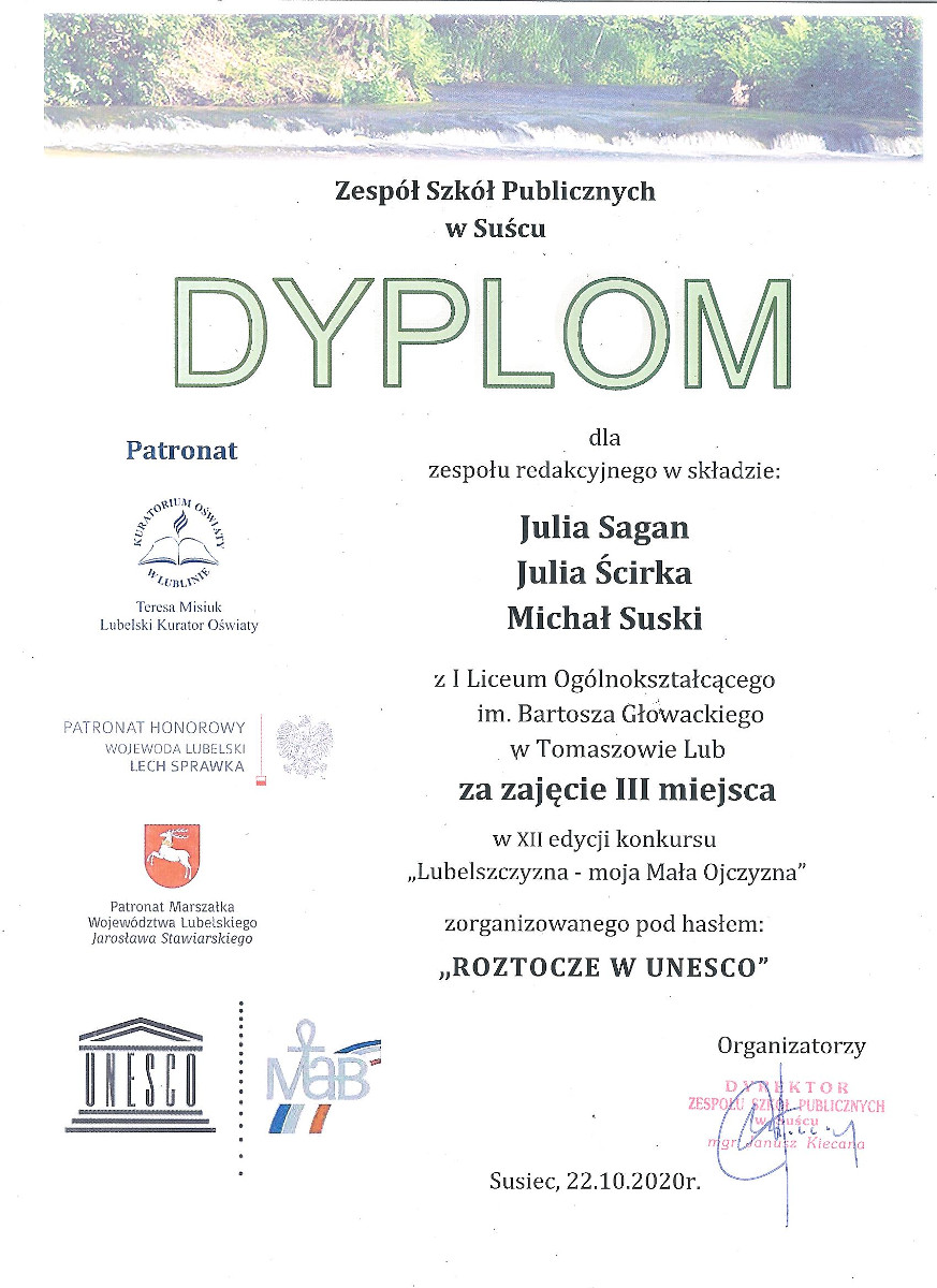 W tegorocznej XII edycji konkursu „Lubelszczyzna- moja Mała Ojczyzna” zorganizowanego pod hasłem: „ROTOCZE W UNESCO” wzięła udział drużyna reprezentująca naszą szkołę. W jej skład wchodzili: Julia Sagan, Julia Ścirka i Michał Suski. Nasi uczniowie tradycyjnie już zdobyli w tym konkursie III miejsce.