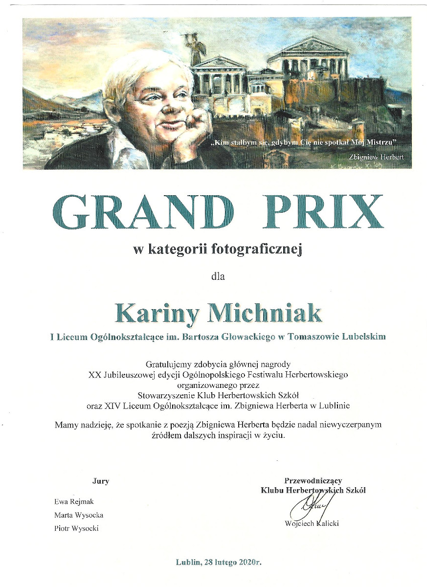 Karina Michniak, uczennica klasy II d, odniosła spektakularny sukces w XX Jubileuszowej edycji Ogólnopolskiego Festiwalu Herbertowskiego. Prace inspirowane poezją tego artysty nadsyłali uczniowie z całego kraju, co podkreśla wagę sukcesu Kariny.