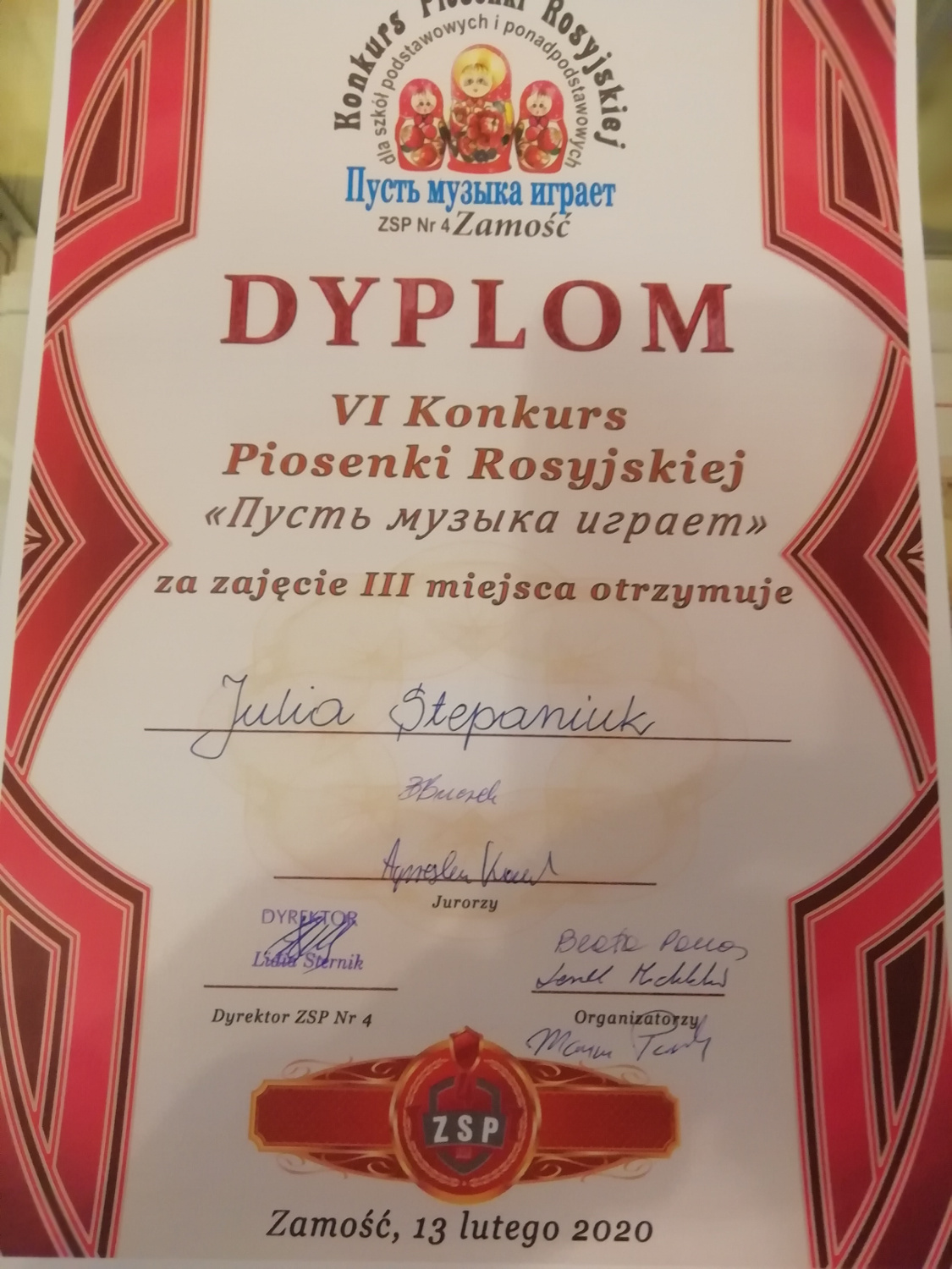 13 lutego 2020 r. odbył się VI Wojewódzki Konkurs Piosenki Rosyjskiej organizowany przez Zespół Szkół Ponadpodstawowych Nr 4 w Zamościu. Naszą szkołę godnie reprezentowała Julia Stepaniuk, uczennica klasy Idg, utalentowana solistka zespołu The One. Po raz kolejny zdobyła miejsce na podium, uzyskując III miejsce. W konkursie rywalizowali uczniowie z liceów w Zamościu, Hrubieszowie, Chełmie, Biłgoraju, Łaszczowie i Tomaszowie Lubelskim.