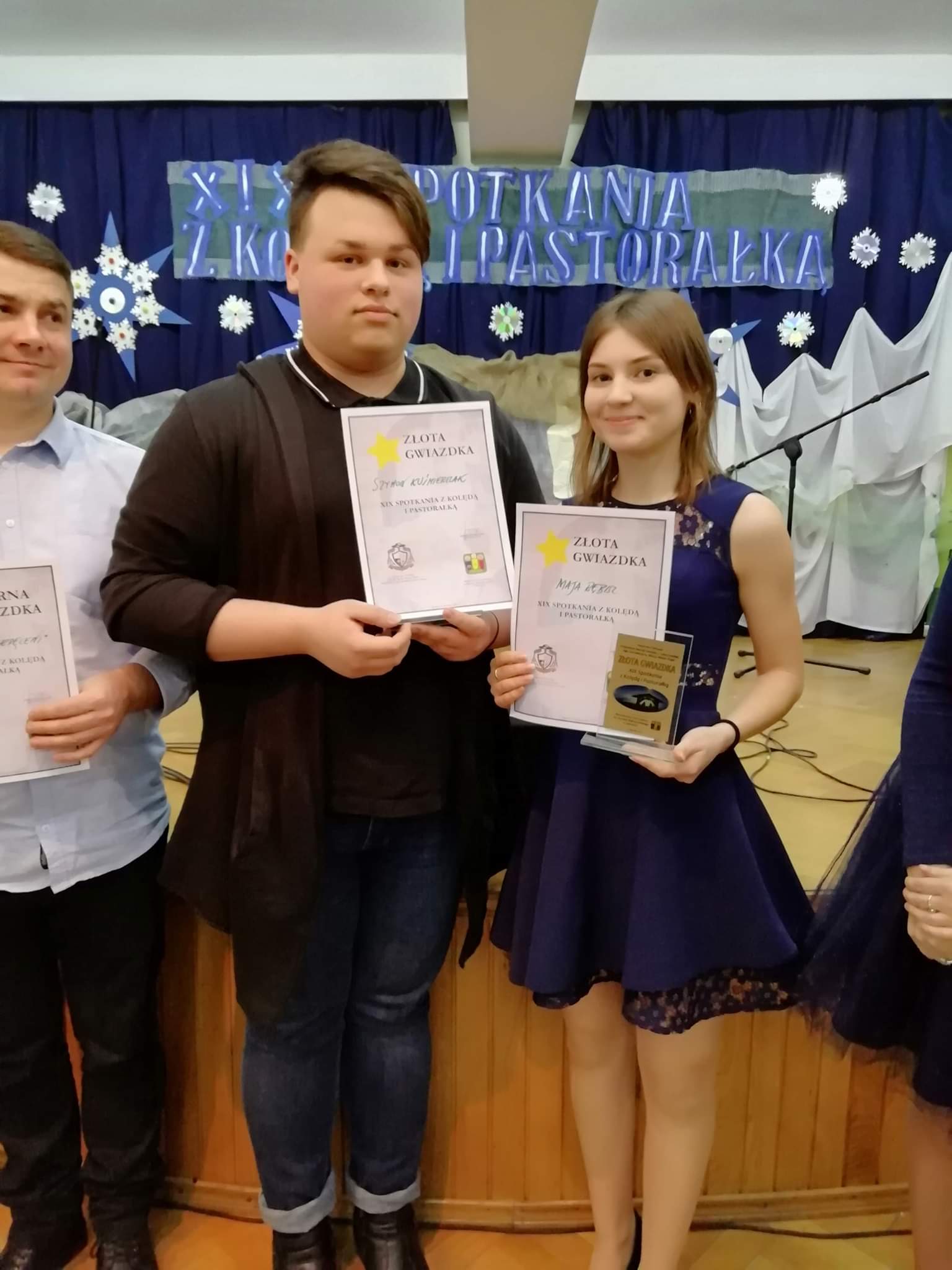 Tradycyjną kolędą „ Z narodzenia Pana” w nowej aranżacji, uczeń naszej szkoły, Szymon Kuśmierczak wyśpiewał 9 stycznia 2019r. „Złotą gwiazdkę” na konkursie wojewódzkim „ XIX Spotkania z Kolędą i Pastorałką”, organizowanym przez Młodzieżowy Dom Kultury w Zamościu. W konkursie uczestniczyła też uczennica naszej szkoły Maja Rębisz, która wykonaniem kolędy „Przybądźcie o wierni” zachwyciła jury konkursowe i zdobyła równorzędne z Szymonem miejsce. Gratulujemy wokalistom „Złotych gwiazdek”, życzymy dalszych sukcesów scenicznych i cieszymy się, że tak godnie reprezentują naszą szkołę!
