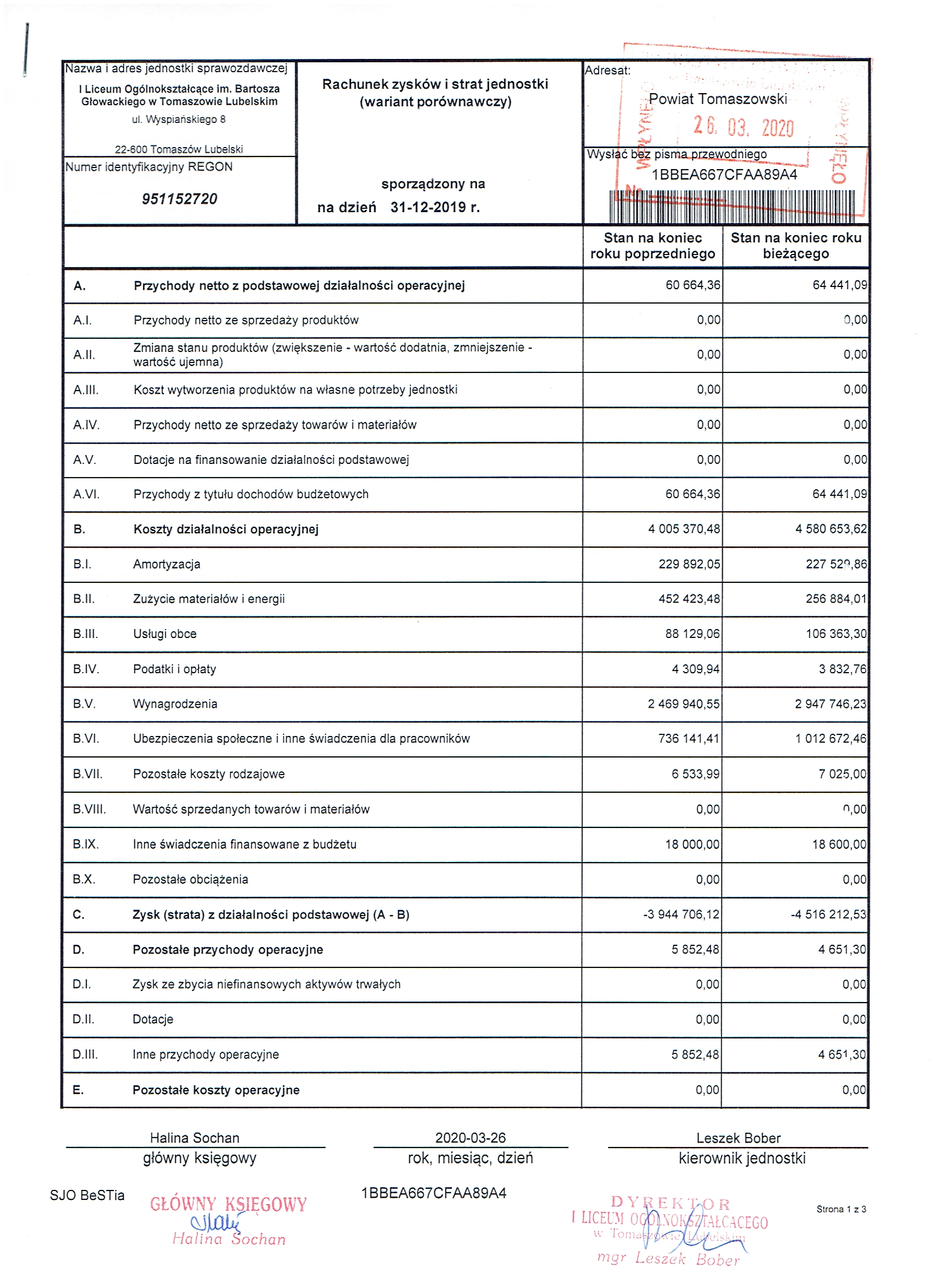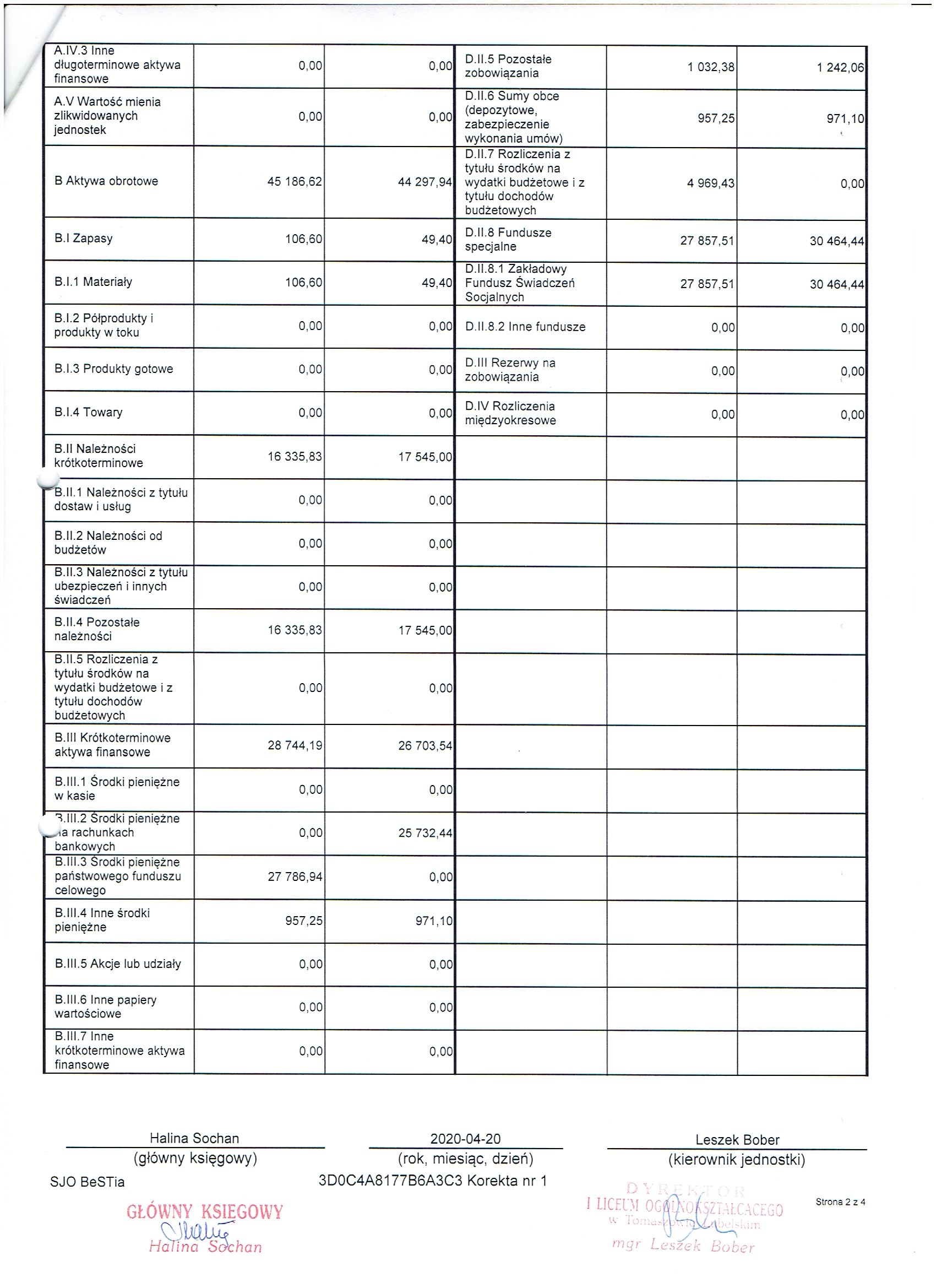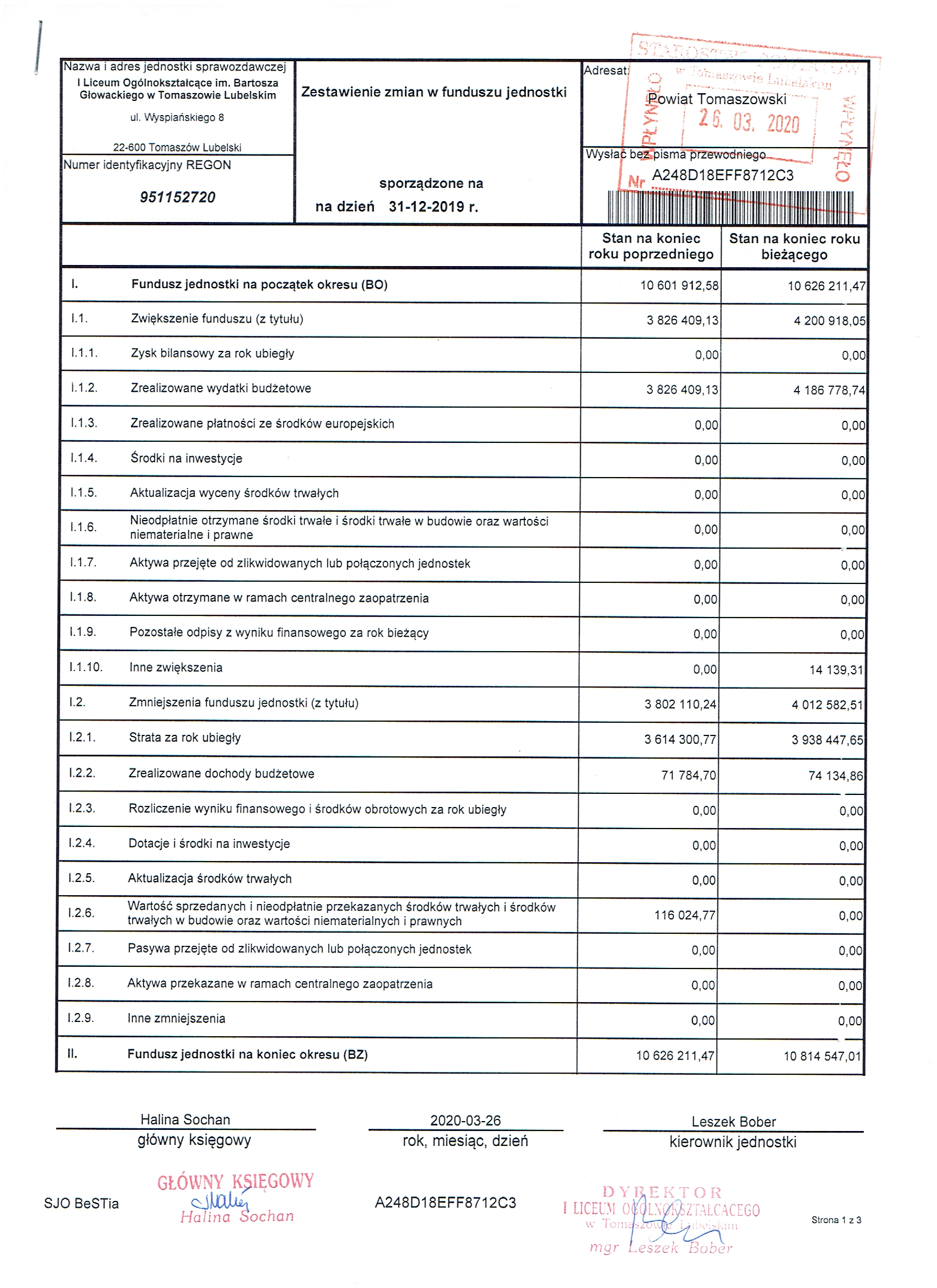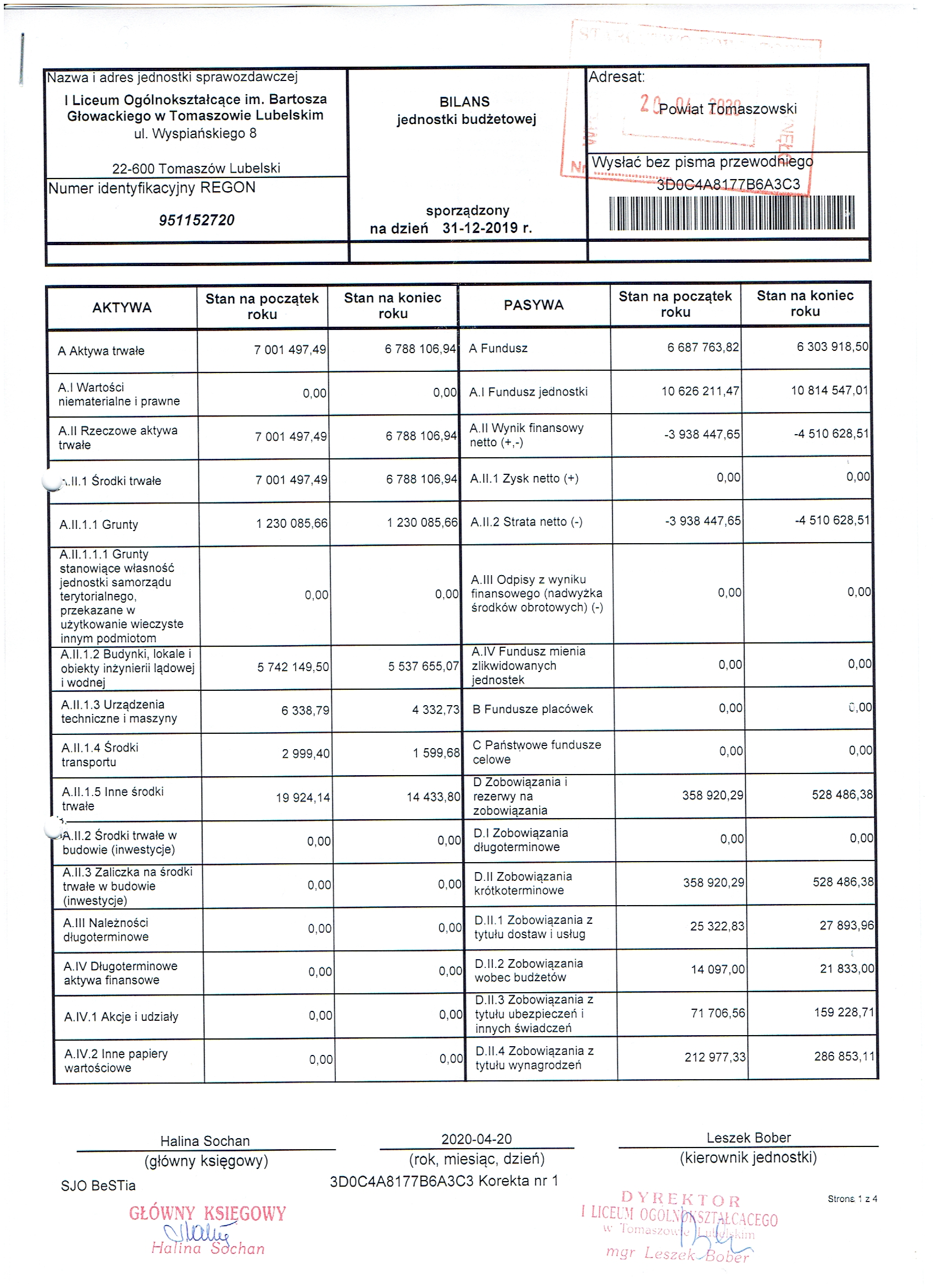 Załączniki 1: Bilans jednostki budżetowej i samorządowego zakładu budżetowego sporządzony na dzień 31-12-2019