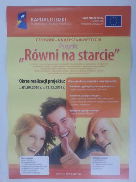 W grudniu 2011 r. zakończono w BARTOSZU realizację wielkiego przedsięwzięcia - projektu pod nazwą ,,Równi na starcie’’ współfinansowanego ze środków Unii Europejskiej w ramach Europejskiego Funduszu Społecznego. Zgodnie z wcześniej przyjętymi założeniami w szkole były organizowane zajęcia wyrównawcze z matematyki, fizyki, chemii i języka angielskiego oraz pozalekcyjne zajęcia dodatkowe rozszerzające materiał realizowany podczas lekcji programowych z biologii, chemii, j. angielskiego, matematyki i fizyki. Zajęcia te były prowadzone przez naszych nauczycieli , którzy często korzystali z pomocy wykładowców lubelskich wyższych uczelni, zapraszając ich do szkoły w celu przeprowadzenia wykładów, prelekcji lub zajęć warsztatowych związanych z tematyką prowadzonych przez siebie zajęć. Warto również wspomnieć o trzech wyjazdach edukacyjnych (do Warszawy i Lublina), które z pewnością zostały na długo w pamięci naszych uczniów, umożliwiły im bowiem kontakt z nauką w wymiarze akademickim. Dla wielu z nich było to pierwsze zetknięcie z salą wykładową lub laboratorium z ,,prawdziwego zdarzenia’’. Oglądanie takich miejsc jak Instytut Badań Jądrowych w Świerku, Centrum Nauki Kopernik, czy też laboratorium Instytutu Fizyki PAN z pewnością zmotywowało niejednego uczestnika projektu do nauki, rozbudzając zainteresowania przedmiotami matematyczno-przyrodniczymi. Działaniami tymi objęto 235 uczniów, którzy korzystając z materialnego wsparcia uczestniczyli w różnych formach zajęć w ramach projektu. Niebagatelne znaczenie dla całej społeczności szkolnej mają wymierne korzyści w postaci pozyskania środków trwałych sfinansowanych przez Europejski Fundusz Społeczny. Łączną wartość tych środków oszacowano na sumę 31 283, 54 zł. Dzięki uczestnictwu w projekcie szkoła zyskała sprzęt do pracowni przedmiotowych, programy komputerowe, cenne pomoce dydaktyczne oraz bogate wyposażenie biura projektu.