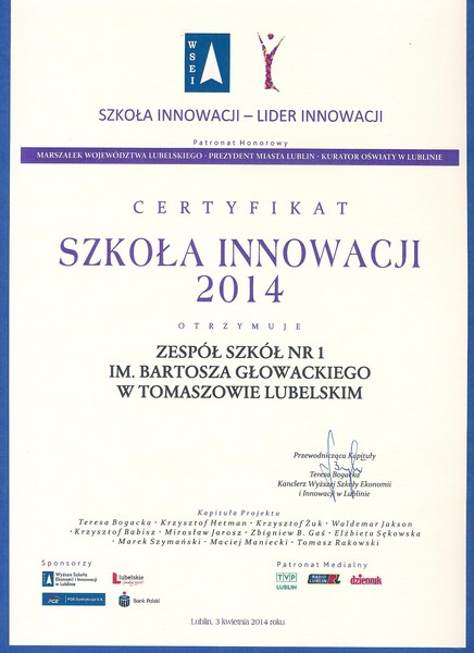 Certyfikat „Szkoła Innowacji- Lider Innowacji”, który dwukrotnie został przyznany naszej szkole w latach 2013-2014, jest inicjatywą lubelskiej Wyższej Szkoły Ekonomii i Innowacji. Kapituła pod przewodnictwem Kanclerz WSEiI przyznaje certyfikaty szkołom ponadgimnazjalnym w regionie lubelskim, które realizują kreatywne pomysły, inwestują we współpracę międzynarodową i wspierają edukację praktyczną dla rynku pracy.