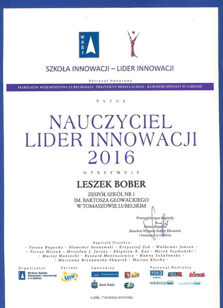 Z projektem certyfikacji szkół innowacyjnych wiążę się drugi ogromny sukces, który tym razem ma na swoim koncie także dyrektor BARTOSZA pan Leszek Bober. W kategorii NAUCZYCIEL - LIDER INNOWACJI okazał się bezkonkurencyjny i uzyskał pierwsze miejsce wśród wszystkich nominowanych nauczycieli, tym samym zdobywając prestiżowy tytuł NAUCZYCIELA LIDERA INNOWACJI 2016 .