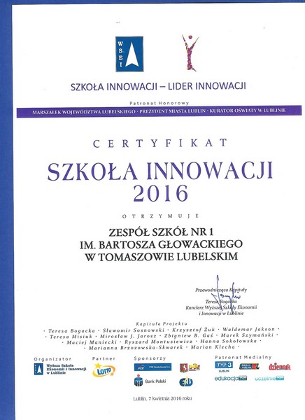 Zespół Szkół Nr 1 w Tomaszowie Lubelskim znalazł się w elitarnym gronie placówek, którym przyznano tytuł SZKOŁY INNOWACJI 2016.