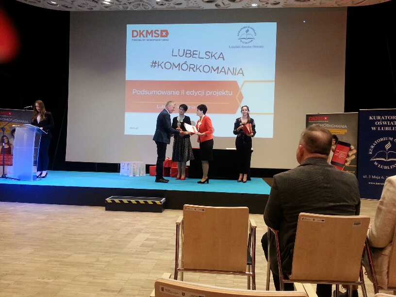 W dniu 9 kwietnia 2018 r. w Lubelskim Centrum Kongresowym odbyła się gala podsumowująca kolejny rok akcji prowadzonej przez Fundację DKMS "Lubelska # Komórkomania". W trakcie gali w dowód uznania za prowadzoną działalność przedstawicielom wyróżnionych szkół wręczono Certyfikaty "Szkoły z życiem". Akcja rejestracji potencjalnych dawców szpiku i komórek macierzystych przebiega pod patronatem Lubelskiego Kuratora Oświaty. W bieżącym roku szkolnym uczniowie naszej szkoły dwukrotnie organizowali akcję rejestracji dawców w dniach 6 października 2017 r. i 8 marca 2018 r. Ostatnia akcja przebiegała pod hasłem „ POMÓŻ FILIPKOWI I INNYM...". W naszej szkole koordynacją tych działań zajmuje się pani Dorota Stawarska.